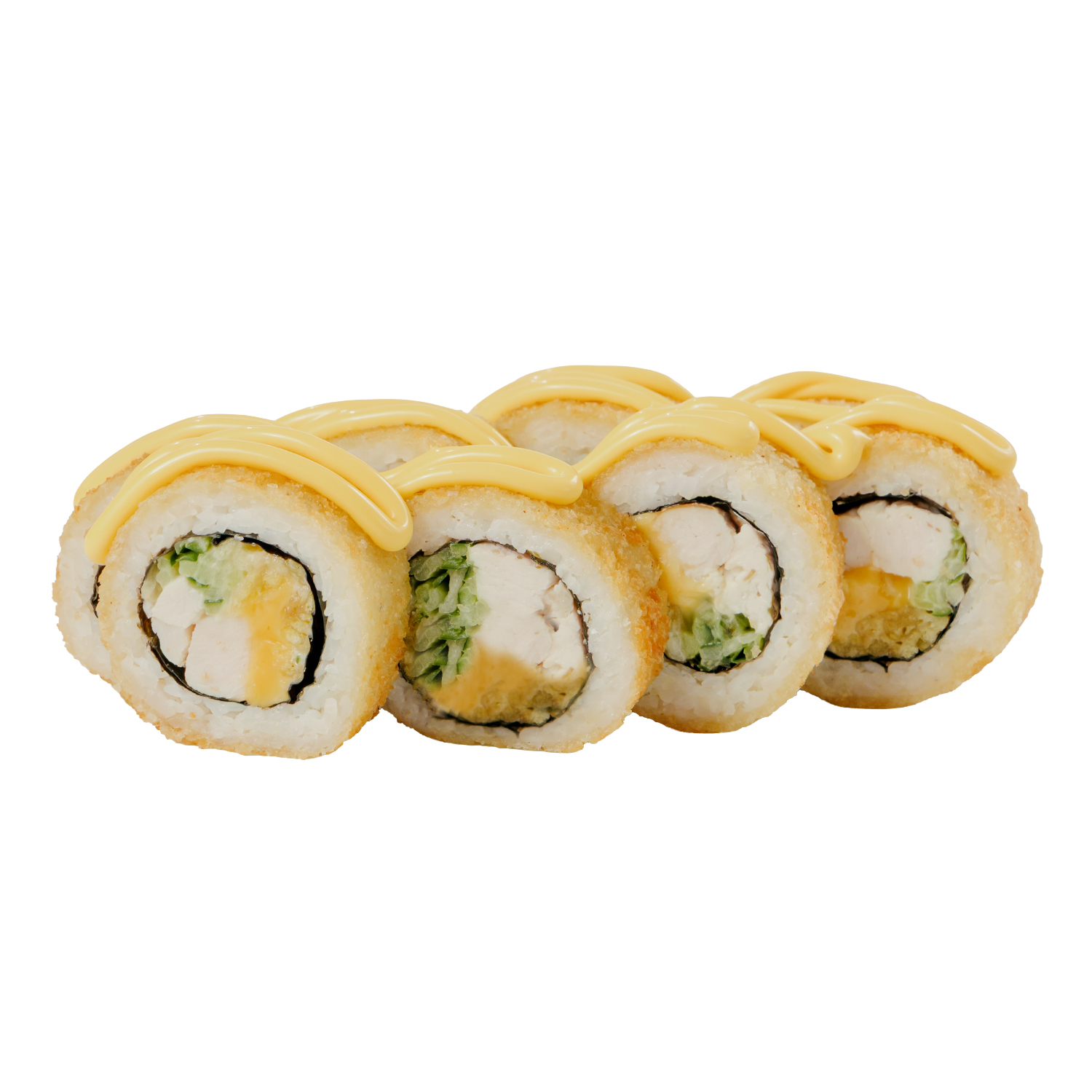 Нори,рис,копченая курица,омлет томаго,огурец,морковь,капуста айсберг,помидор,унаги соус,кунжут